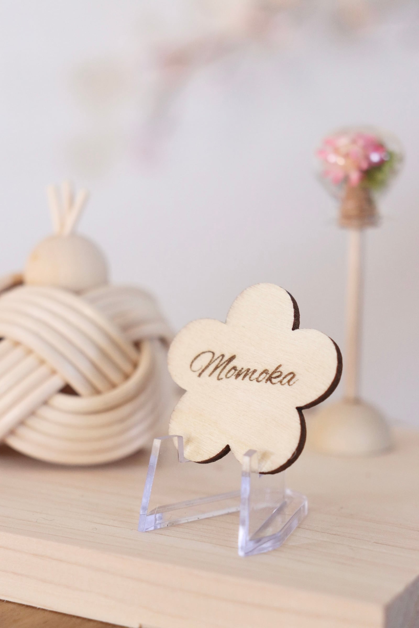 お花の木型に名前を彫刻致します。