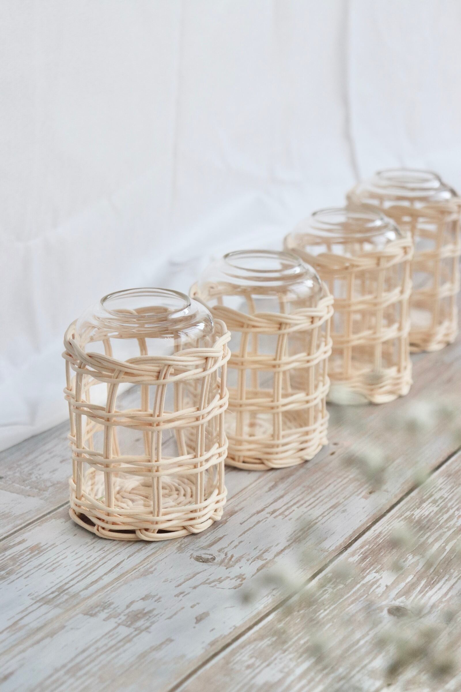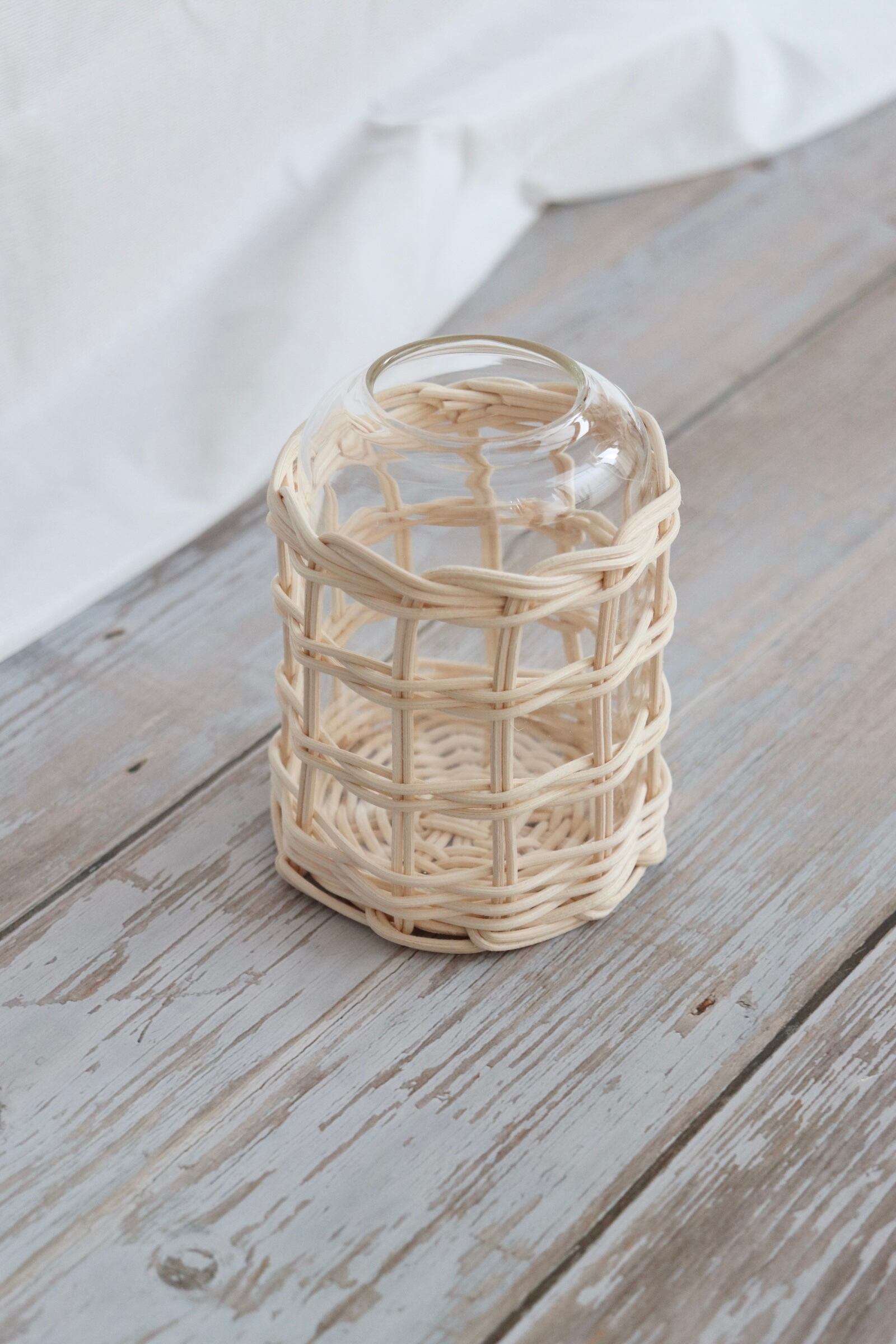 ひとつひとつ手編みしたラタンフラワーベースを